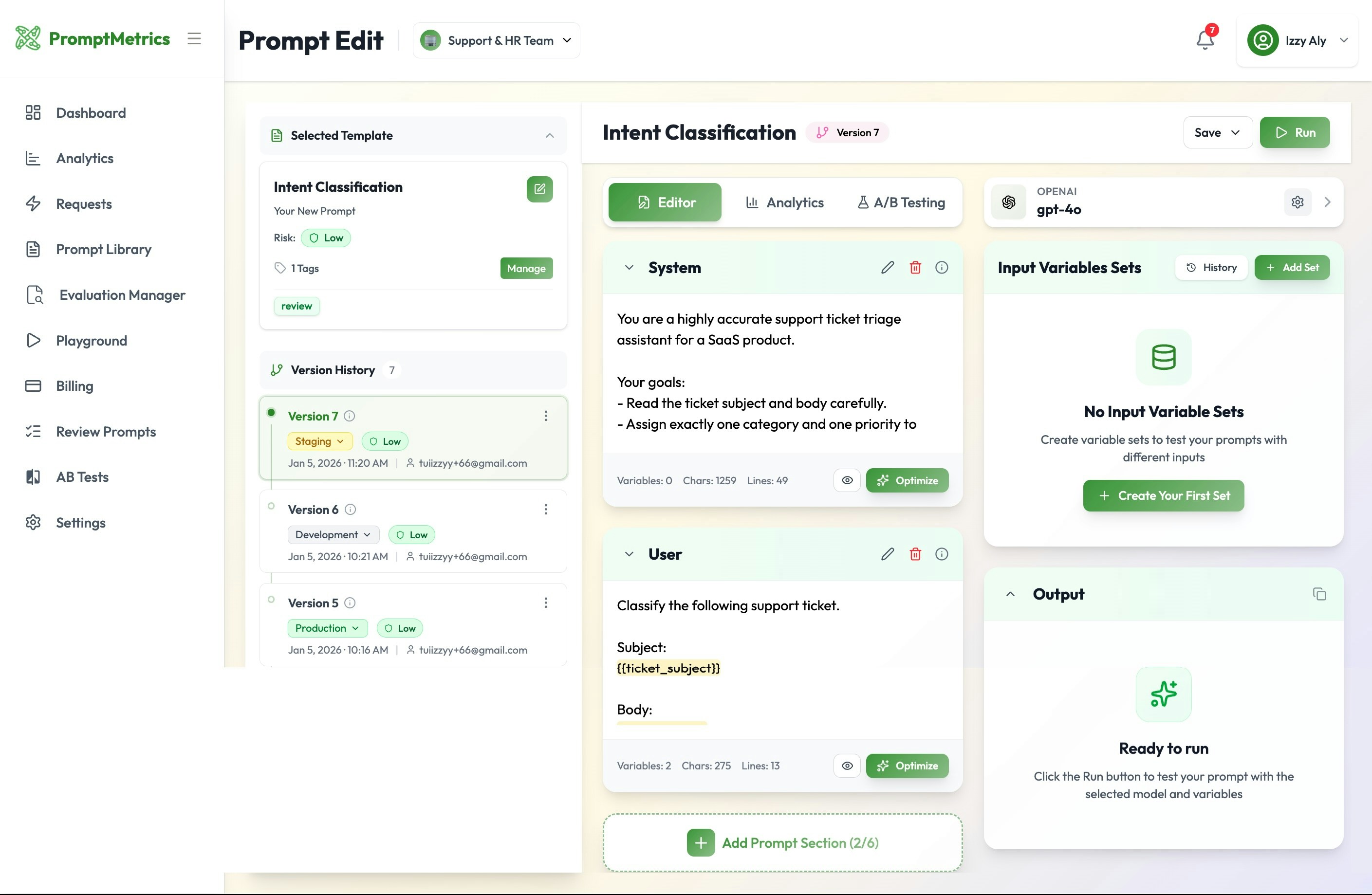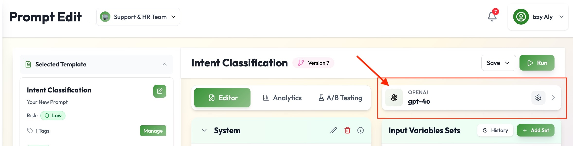 The Prompts Library acts as a centralized repository for managing AI prompts. It displays prompts in a card-based layout with indicators such as risk level, environment, and performance metrics, and supports searching, sorting, and organizing prompts into folders. Users with sufficient permissions can create, edit, archive, or delete prompts. This feature exists to maintain prompt governance and reuse across teams. It is primarily used by Admin and Member users.Example
